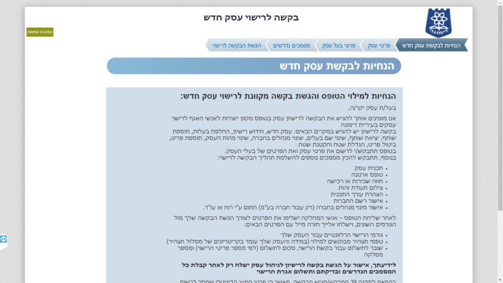 צילום מסך טופס בקשה לרישיון עסק טופס מקוון