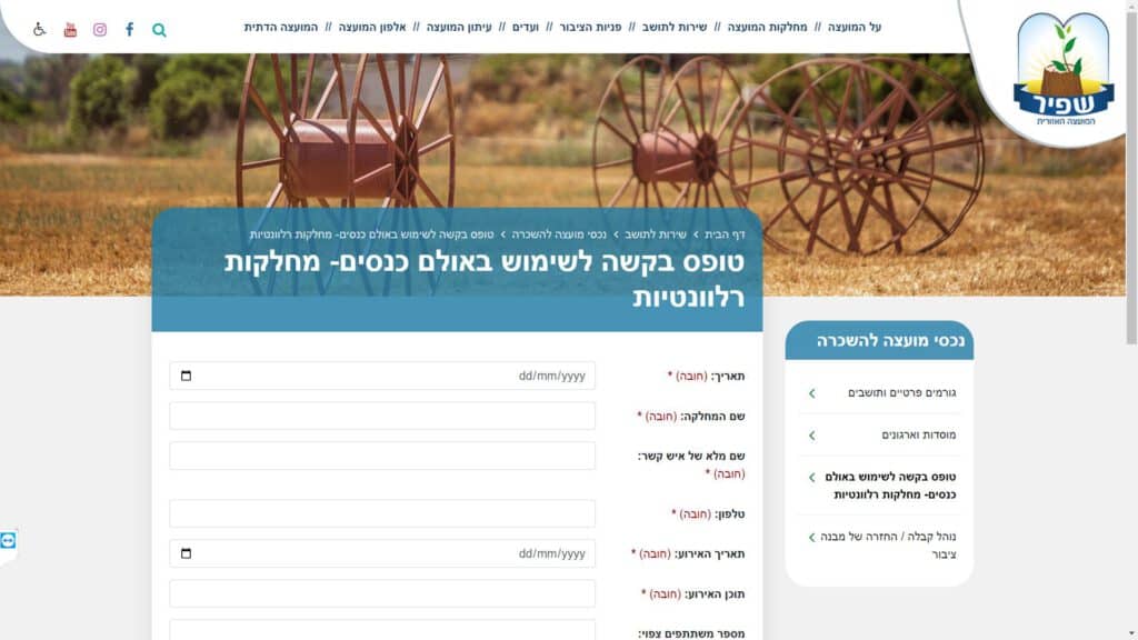 טופס קל » עיריות » עיריות בשפלה » מועצה אזורית שפיר » פנימיים » טופס בקשה לשימוש באולם כנסים – מחלקות רלוונטיות