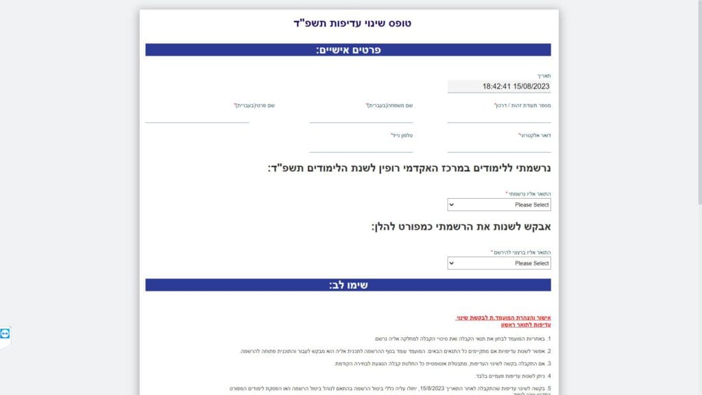 צילום מסך טופס בקשה לשינוי עדיפות טופס מקוון