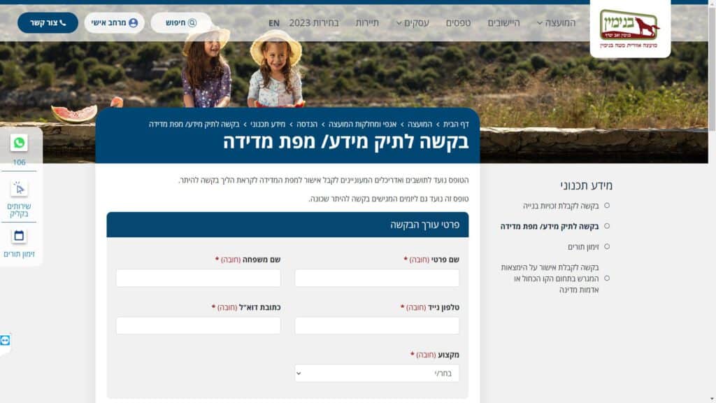 צילום מסך טופס בקשה לתיק מידע / מפת מדידה טופס מקוון