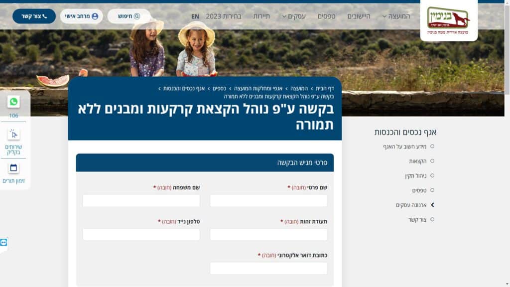 צילום מסך טופס בקשה ע"פ נוהל הקצאת קרקעות ומבנים ללא תמורה טופס מקוון