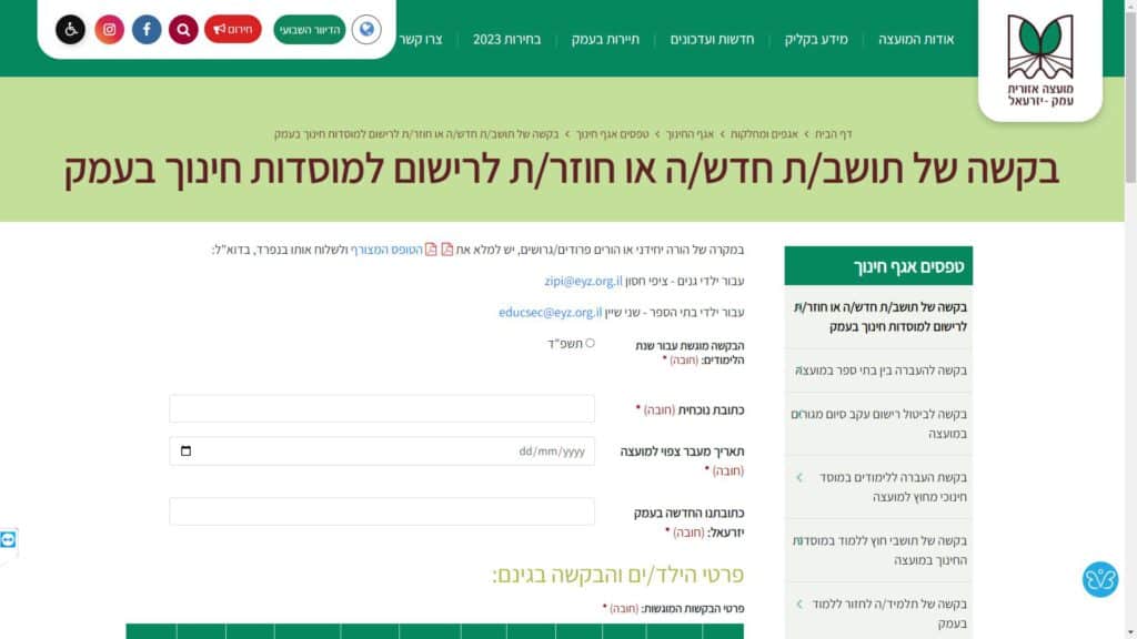 טופס קל » עיריות » עיריות בטבריה והעמקים » מועצה אזורית עמק יזרעאל » חינוך » טופס בקשה של תושבים חדשים / חוזרים ללמוד במועצה
