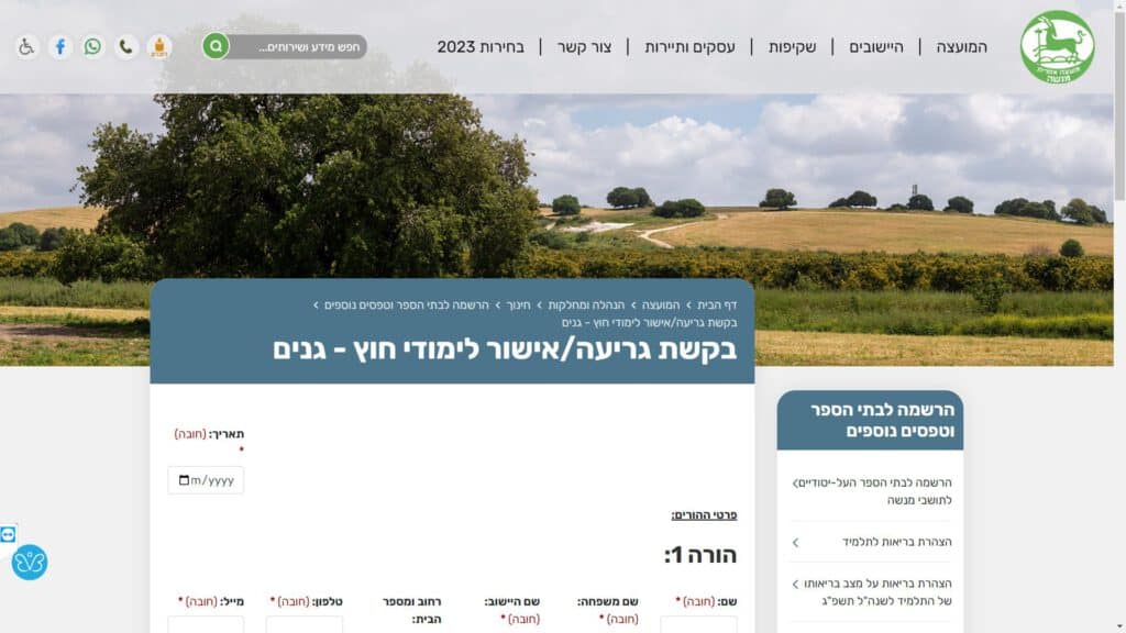 צילום מסך טופס בקשת גריעה / אישור לימודי חוץ - גנים טופס מקוון
