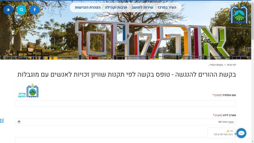 טופס קל » עיריות » עיריות בדרום » עיריית אופקים » חינוך » טופס בקשת ההורים להנגשה – טופס בקשה לפי תקנות שוויון זכויות לאנשים עם מוגבלות
