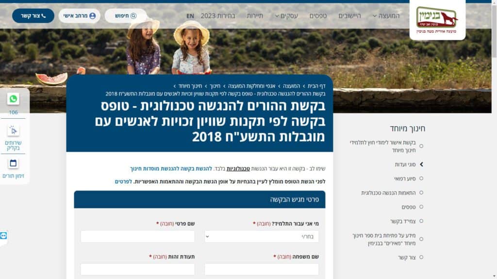 צילום מסך טופס בקשת הורים להנגשה טכנולוגית - לפי תקנות שוויון זכויות לאנשים עם מוגבלות התשע"ח 2018 טופס מקוון