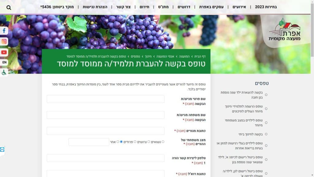 טופס קל » עיריות » עיריות בירושלים והסביבה » מועצה מקומית אפרת » בתי ספר » טופס בקשת העברת תלמיד / ה ממוסד למוסד