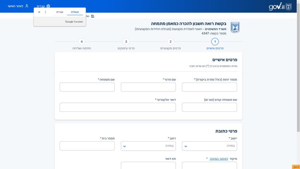 צילום מסך טופס בקשת רואה חשבון לאמן מתמחים טופס מקוון