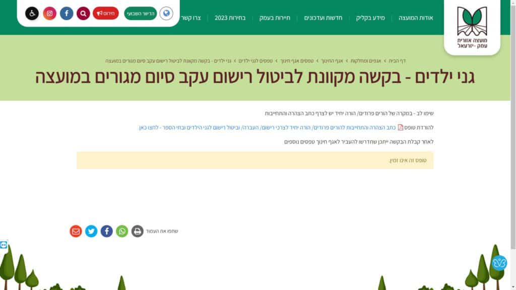 טופס גני ילדים - בקשה מקוונת לביטול רישום עקב סיום מגורים במועצה חלופה נגישה - כרגע לא קיימת.