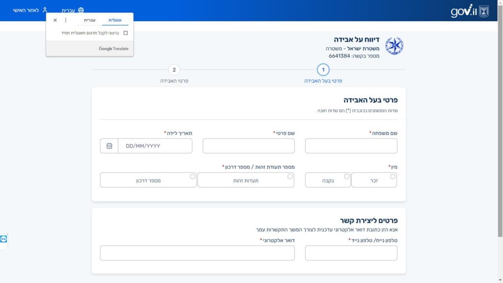 צילום מסך טופס דיווח למשטרה על אבדה טופס מקוון