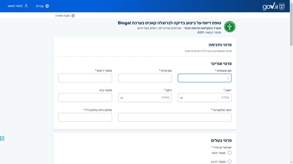 צילום מסך טופס דיווח על ביצוע בדיקה לברוצלה קאניס בערכת Biogal טופס מקוון