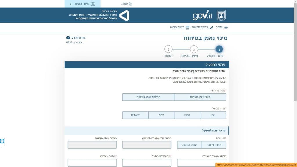 צילום מסך טופס דיווח על מינוי או החלפת נאמן בטיחות במקום עבודה טופס מקוון