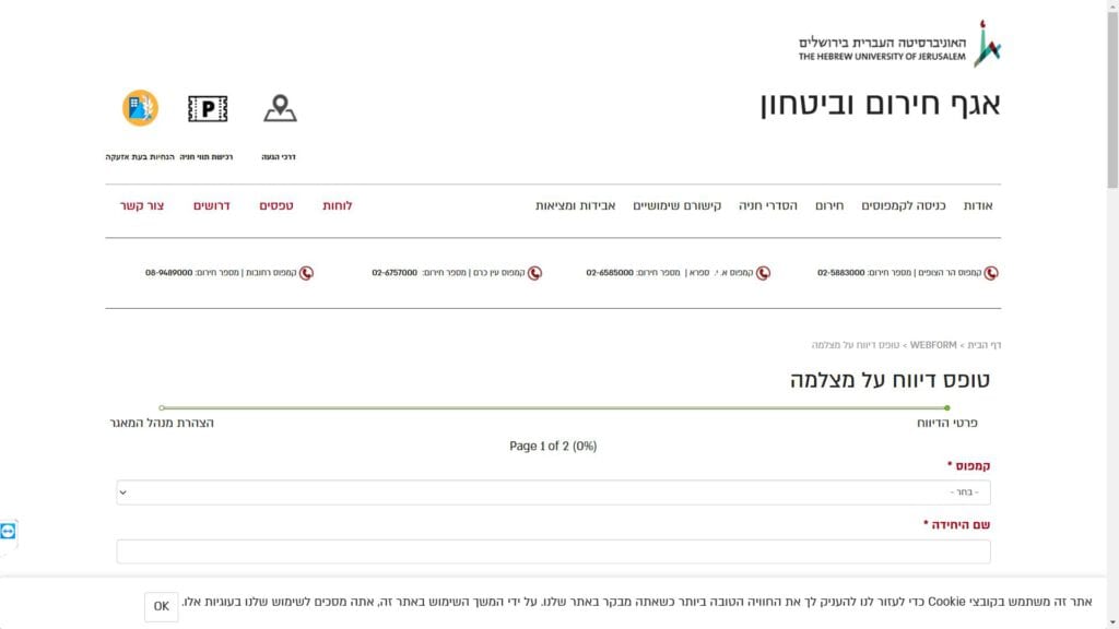 צילום מסך טופס דיווח על מצלמות בקמפוס טופס מקוון
