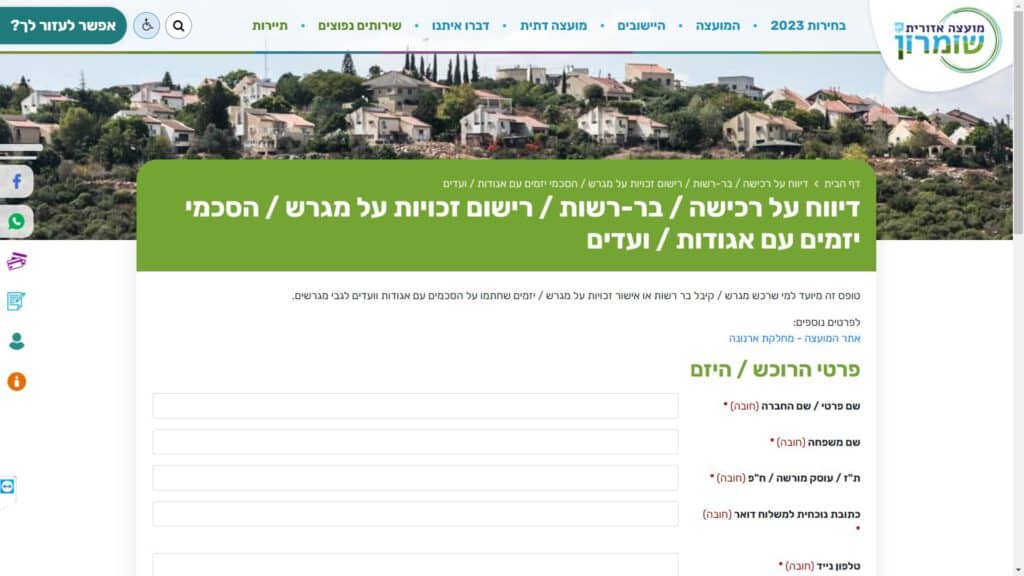 צילום מסך טופס דיווח על רכישה / בר - רשות / רישום זכויות על מגרש / הסכמי יזמים עם אגודות / ועדים טופס מקוון