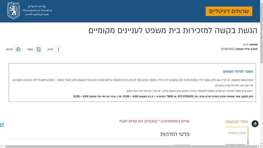צילום מסך טופס הגשת בקשה למזכירות בית משפט לעניינים מקומיים טופס מקוון