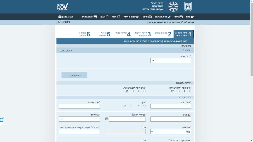 צילום מסך טופס הגשת בקשה למשרות בארץ של משרד החוץ טופס מקוון