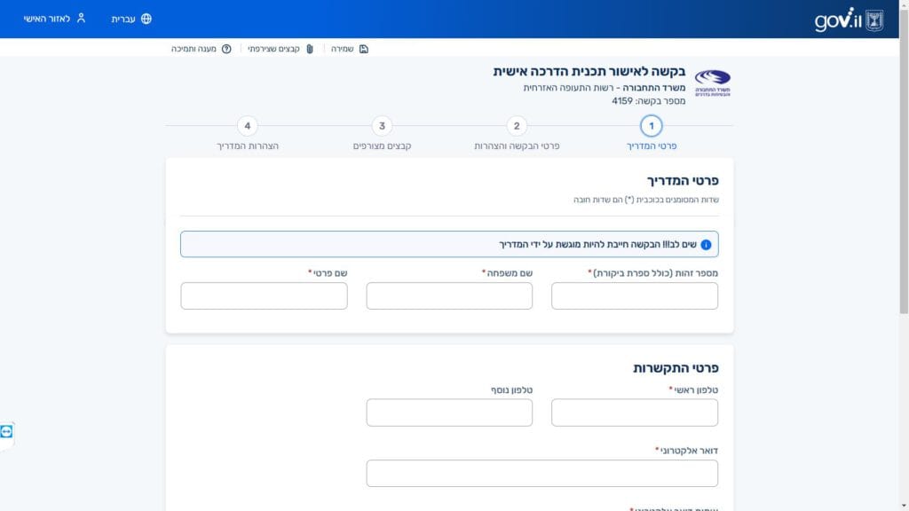 צילום מסך טופס הגשת בקשה לקבלת אישור ולביצוע תכנית הדרכה אישית לרישיון טיס או הגדר טופס מקוון