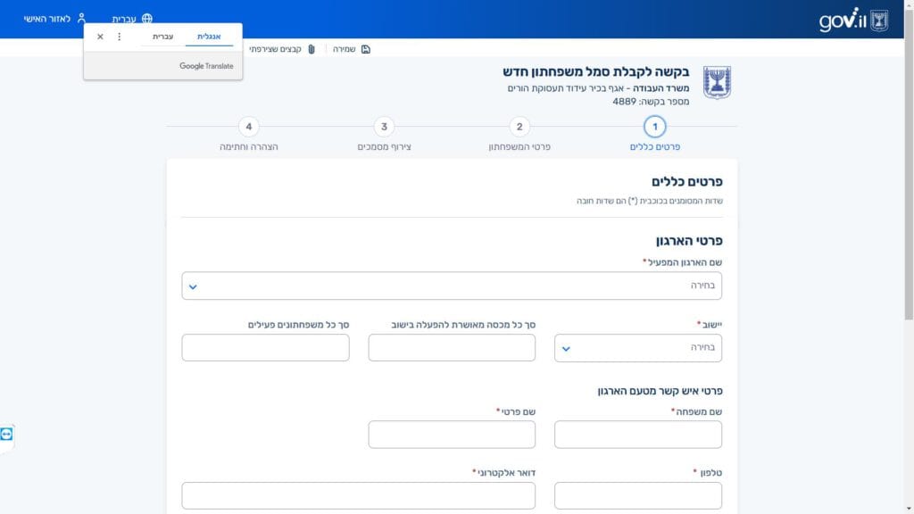 צילום מסך טופס הגשת בקשה לקבלת סמל משפחתון טופס מקוון