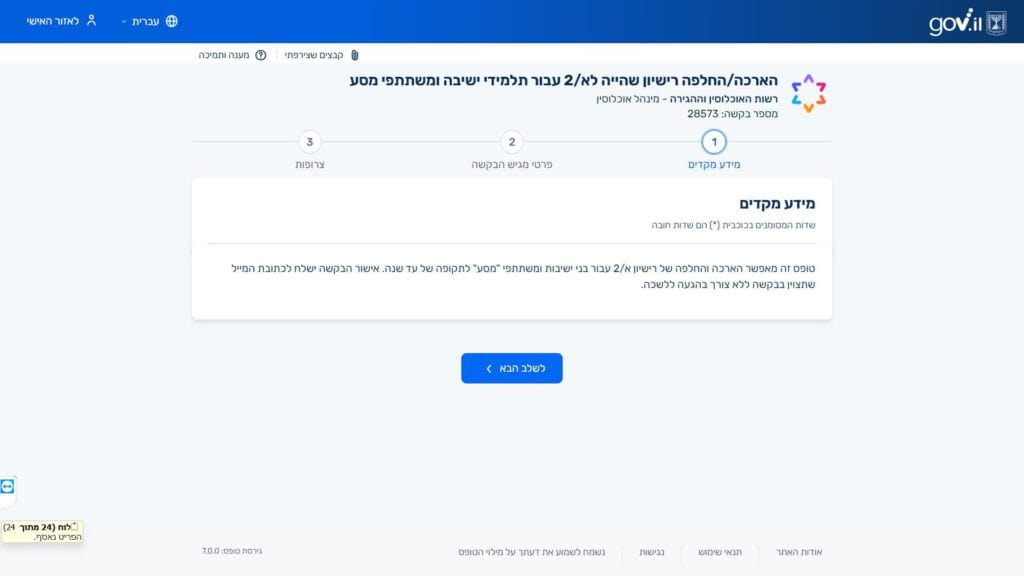 צילום מסך טופס הגשת בקשה לקבלת רישיון א / 2 (סטודנט) טופס מקוון