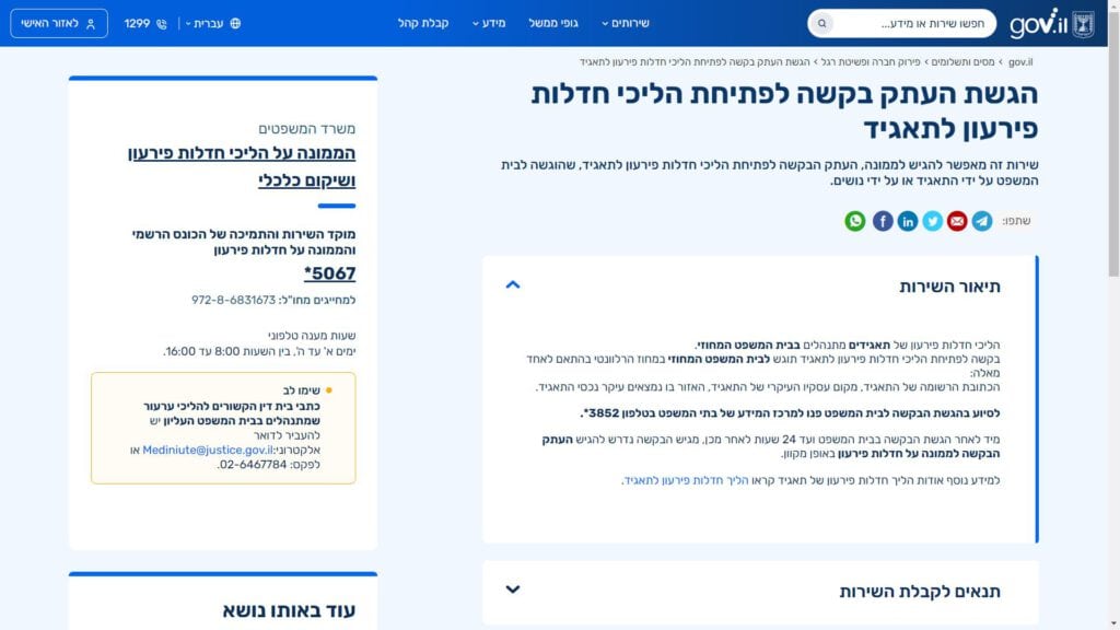גוף שיתמוך בשאלות על טופס הגשת העתק בקשה לפתיחת הליכי חדלות פירעון לתאגיד