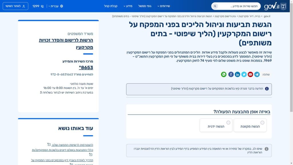 צילום מסך טופס הגשת תביעות בפני המפקח על רישום המקרקעין (הליך שיפוטי - בתים משותפים) טופס מקוון