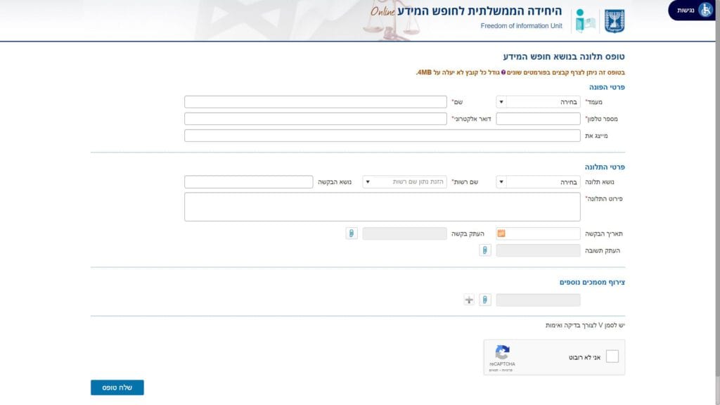 צילום מסך טופס הגשת תלונה ליחידה הממשלתית לחופש המידע טופס מקוון