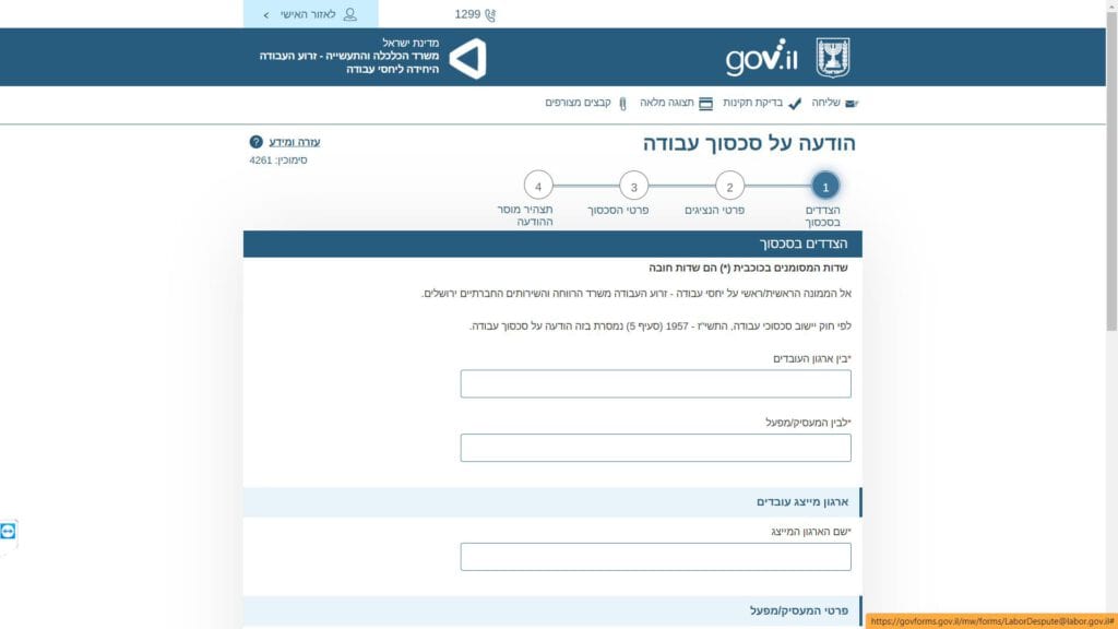טופס קל » משרדים ממשלתיים » משרד העבודה » טופס הודעה על סכסוך עבודה במשק