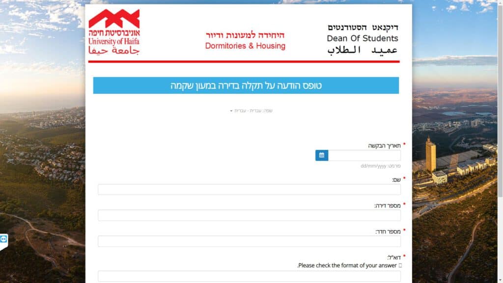 טופס קל » מוסדות לימוד » אוניברסיטת חיפה » דיקנאט הסטודנטים » טופס הודעה על תקלה בדירת מעונות בשקמה