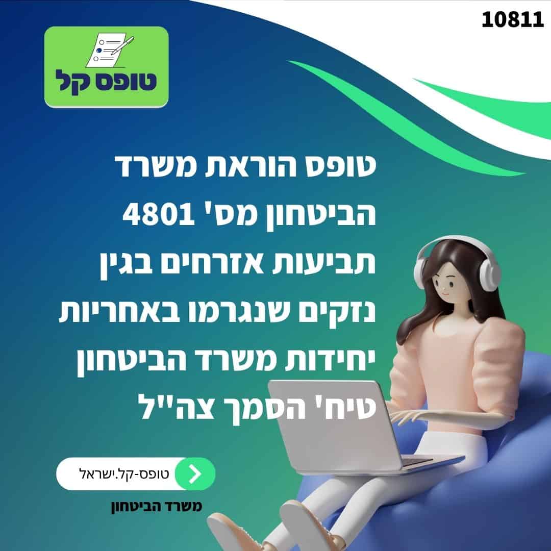 טופס הוראת משרד הביטחון מס' 4801 תביעות אזרחים בגין נזקים שנגרמו באחריות יחידות משרד הביטחון טיח' הסמך צה"ל להדפסה