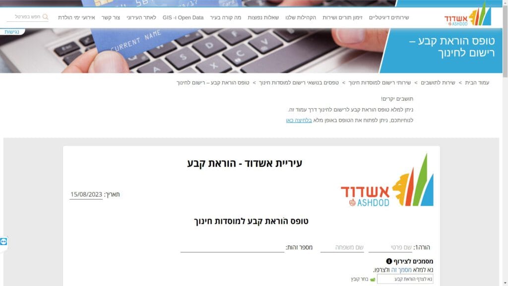 טופס קל » עיריות » עיריות בדרום » עיריית אשדוד » רישום לחינוך » טופס הוראת קבע למוסדות חינוך