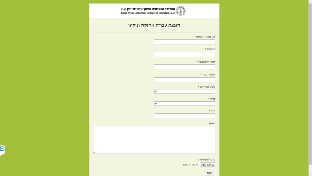 טופס קל » מוסדות לימוד » המכללה האקדמית לחינוך ע"ש דוד ילין » כללי » טופס הזמנת עבודות אחזקה וניקיון