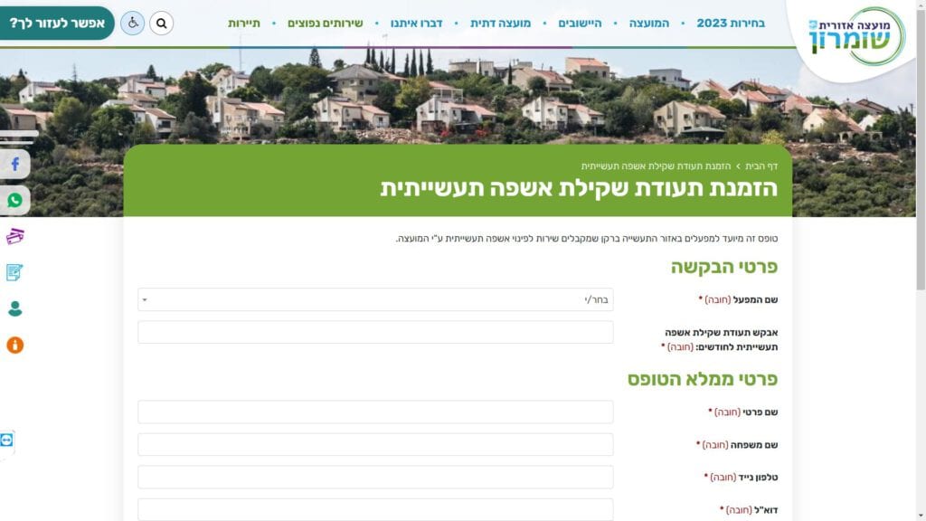 צילום מסך טופס הזמנת תעודת שקילת אשפה תעשייתית טופס מקוון