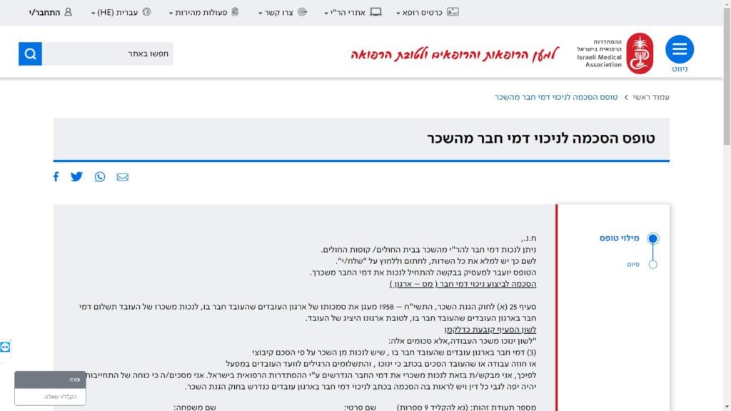 טופס קל » יחידות ממשלתיות » ההסתדרות הרפואית בישראל » כללי » טופס הסכמה לניכוי דמי חבר מהשכר
