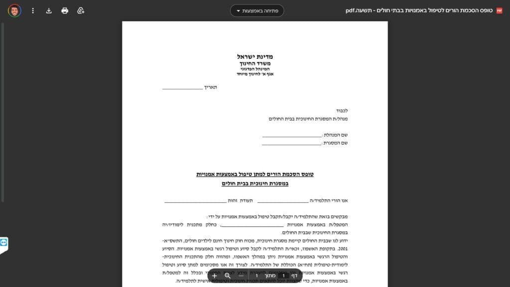 גוף שיתמוך בשאלות על טופס הסכמת הורים לטיפול באמנויות בבתי חולים