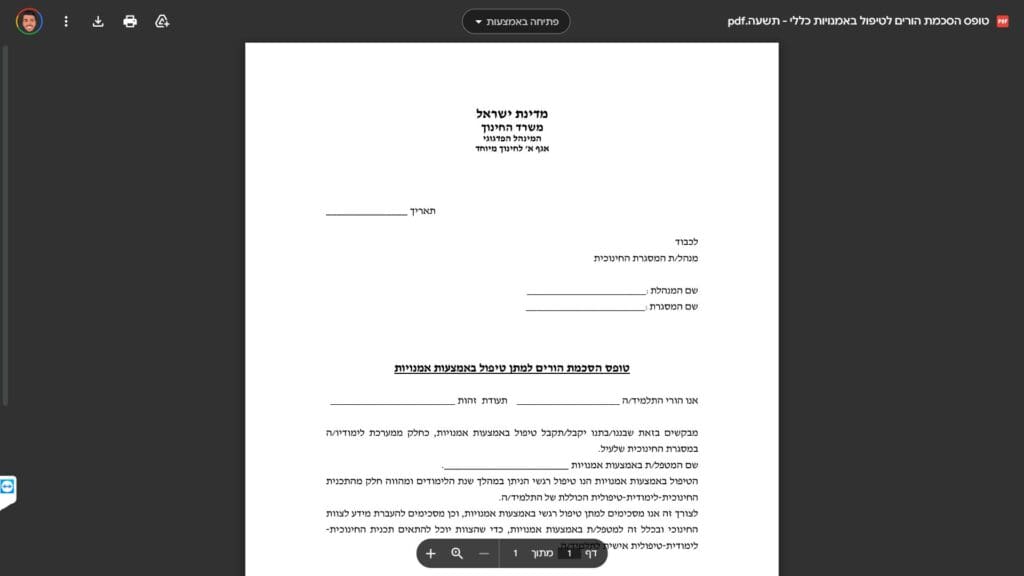 טופס הסכמת הורים לטיפול באמנויות כללי חלופה נגישה - כרגע לא קיימת.