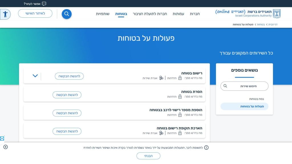טופס הסרה (ביטול משכון) של בטוחות (משכונות) במאגר המשכונות ברשות התאגידים (באמצעות אתר בטוחות) חלופה נגישה - כרגע לא קיימת.