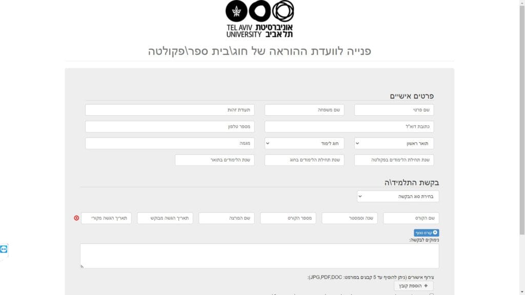 טופס קל » מוסדות לימוד » אוניברסיטת תל אביב » מדעי הרוח » טופס הפניה לוועדת ההוראה של הפקולטה ()