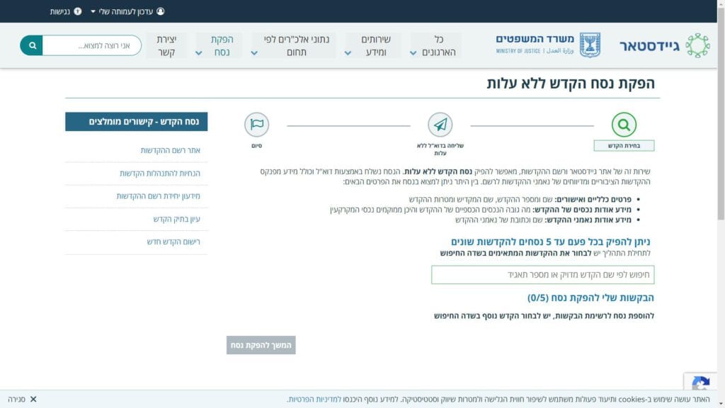 צילום מסך טופס הפקת נסח הקדש ציבורי טופס מקוון