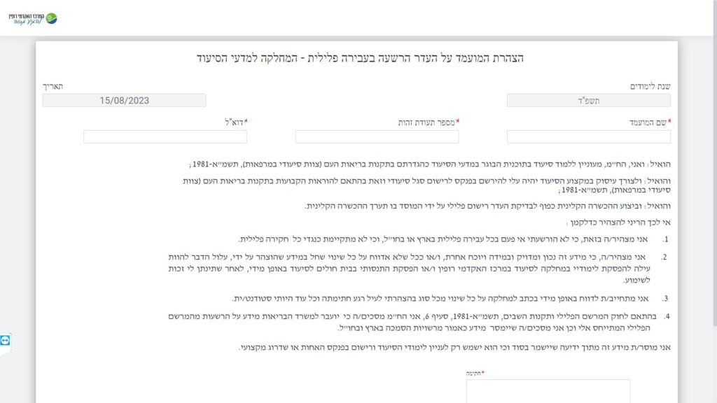 טופס קל » מוסדות לימוד » המרכז האקדמי רופין » מדעי הסיעוד - אח אקדמאי / אחות אקדמאית » טופס הצהרה מקוון על היעדר הרשעה בעבירה פלילית