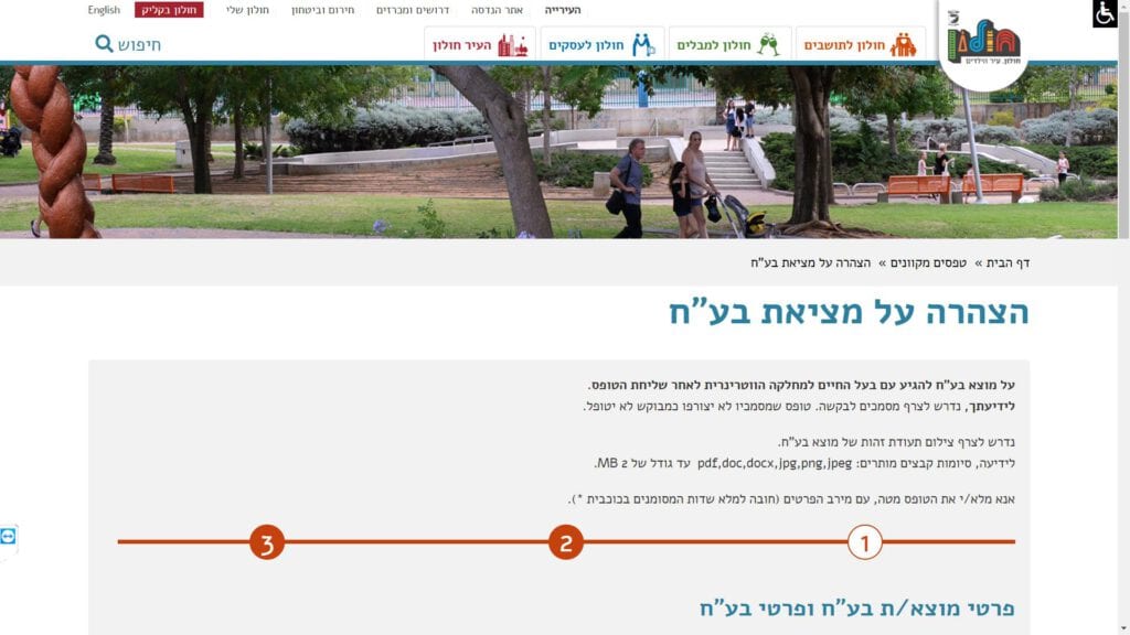 צילום מסך טופס הצהרה על מציאת בעל חיים טופס מקוון