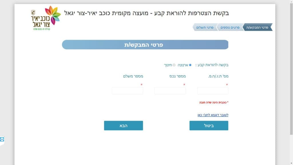 טופס קל » עיריות » עיריות בשרון » כוכב יאיר צור יגאל » ארנונה » טופס הצטרפות להוראת קבע
