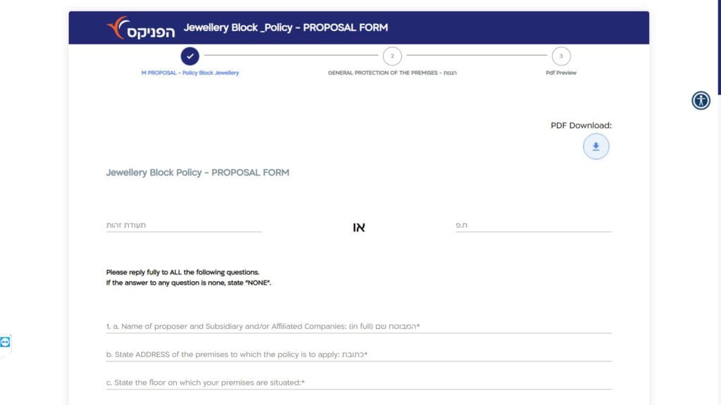 טופס הצעה לביטוח ג'ולרי בלוק - עסקי תכשיטים - ביטוח כללי חלופה נגישה - כרגע לא קיימת.