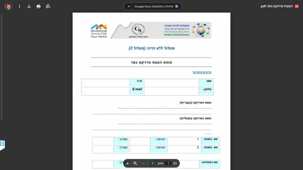 בתחילת המדריך צירפנו עבורך קישור להורדת טופס הצעת פרוייקט גמר. יש ללחוץ על הכפתור ואתה תעבור להורדת הטופס. במידה והינך גולש ממכשיר סלולרי או אייפון לדוגמא שלא מתחיל את ההורדה בצורה מיידית, תוכל לגלול מטה במאמר אל הטופס לצפייה ישירה ולהוריד אותו משם אל המכשיר.