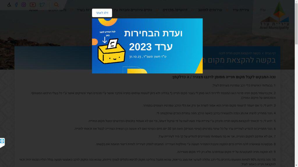 טופס קל » עיריות » עיריות בדרום » עיריית ערד » תחבורה » טופס הקצאת מקום חניה לנכה