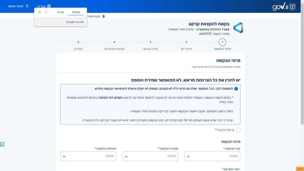 צילום מסך טופס הקצאת קרקע באזורי תעשייה בפטור ממכרז טופס מקוון