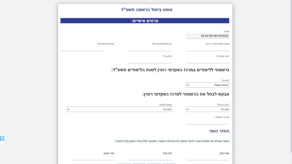 צילום מסך טופס ​טופס ביטו​ל ה​רשמה לתואר ראשון טופס מקוון