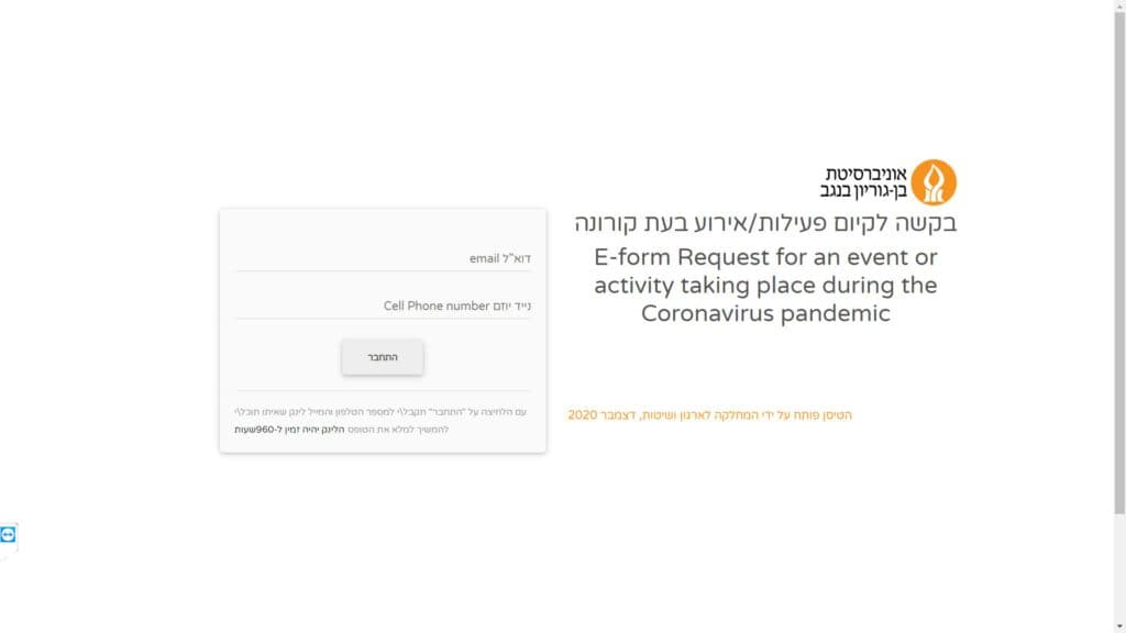 טופס קל » מוסדות לימוד » אוניברסיטת בן גוריון בנגב » המחלקה לאירגון ושיטות » טופס טיסן – דיווח על אירוע או פעילות בעת קורונה