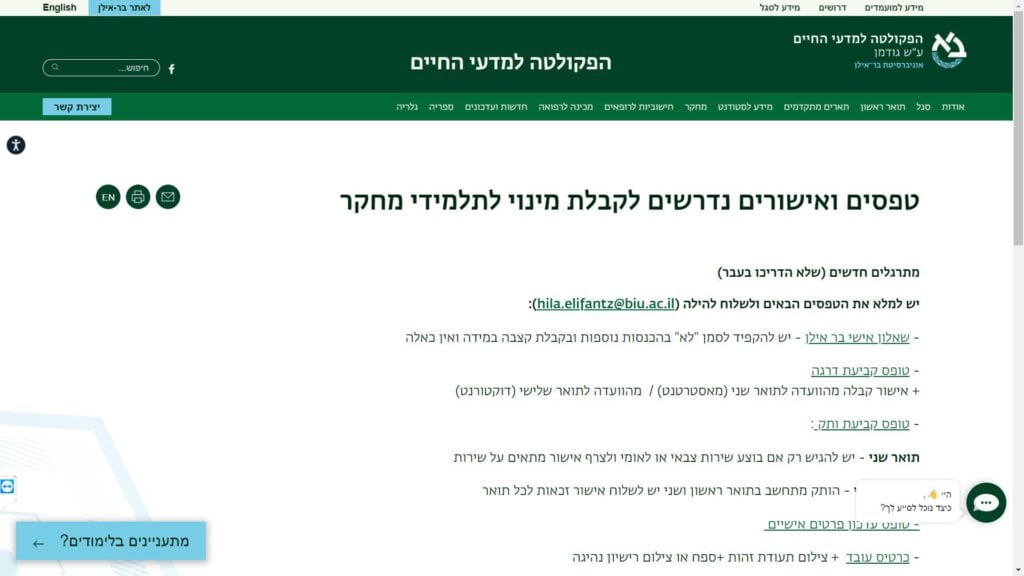 טופס קל » מוסדות לימוד » אוניברסיטת בר אילן » הפקולטה למדעי החיים - תואר ראשון » טופס טפסים ואישורים נדרשים לקבלת מינוי לתלמידי מחקר