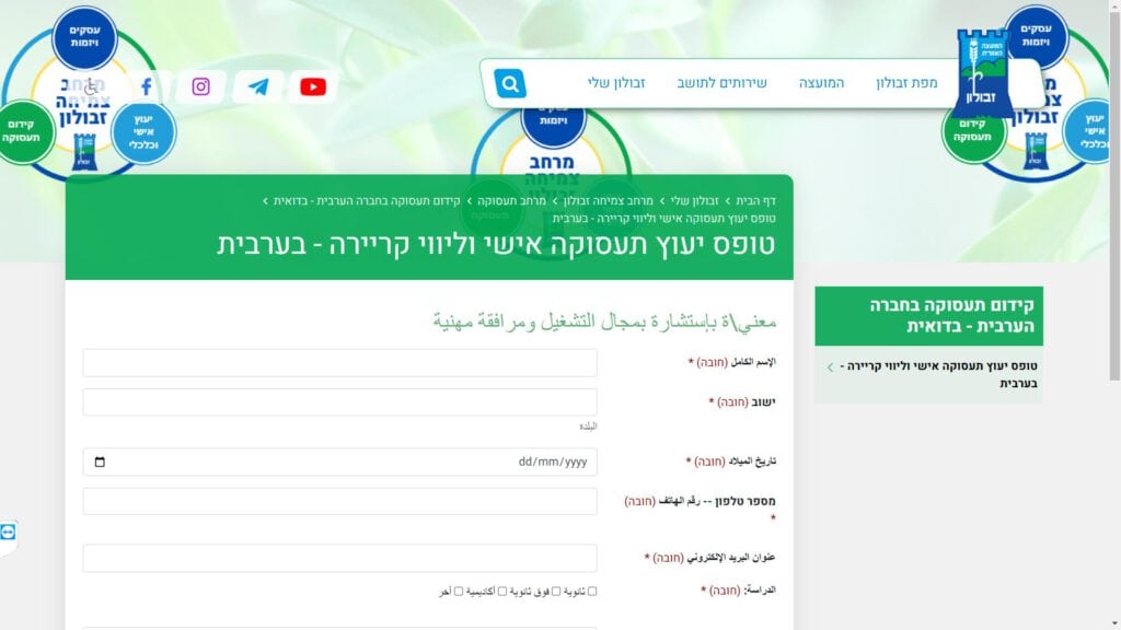 טופס קל » עיריות » עיריות בחיפה והקריות » מועצה מקומית זבולון » תעסוקה » טופס יעוץ תעסוקה אישי וליווי קריירה – בערבית