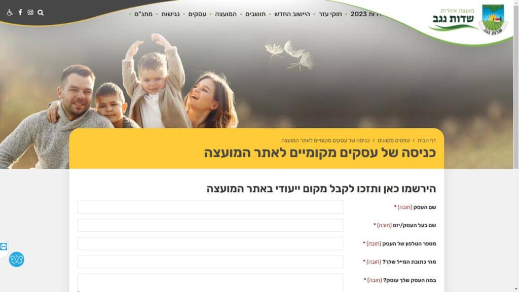 טופס קל » עיריות » עיריות בדרום » מועצה אזורית שדות נגב » עסקים » טופס כניסה של עסקים מקומיים לאתר המועצה