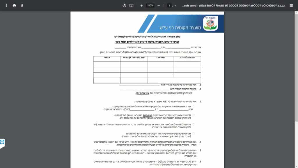 שם הטופס: כתב הצהרה והתחייבות להורים גרושים/פרודים/עצמאיים לצרכי רישום/העברה/ביטול רישום לגילאי ילדים ובתי ספר אח"י.